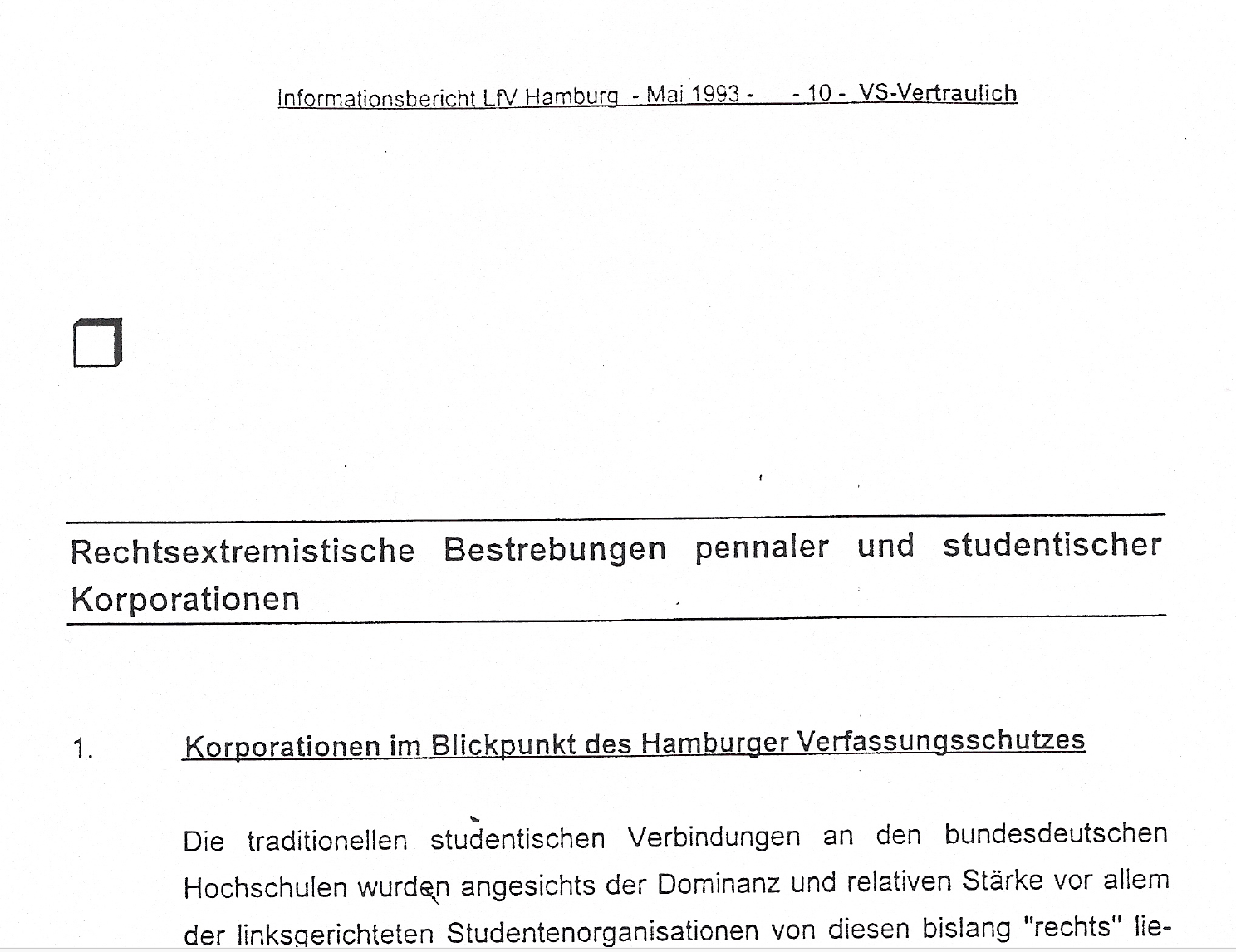 Im Mai des Jahres 1993 erschien ein „Informationsbericht des LfV Hamburg“ mit dem Vermerk „VS-Vertraulich“. Diese vertrauliche Verschlusssache der zweiten Geheimhaltungsstufe ist bis heute nur behördenintern bekannt. In dem 32 Seiten umfassenden Unterkapitel „Rechtsextremistische Bestrebungen pennaler und studentischer Korporationen“ werden einige extrem rechte Studentenverbindungen ausführlich behandelt. Über die Hamburger Burschenschaft Germania (HBG) heißt es dort: „Nationalistisches, rassistisches und antisemitisches Gedankengut ist – nicht zuletzt dank der Aktivitäten von GÖRTZ (gemeint ist der damalige Landesvorsitzende der FAP André Goertz, der eine Doppelmitgliedschaft hatte) u.a. – innerhalb der aktiven Teile der Burschenschaft weit verbreitet. Auf den Semesterkneipen der ‚Germania‘ wird z.T. nationalsozialistisches Liedgut gesungen und in eigenen Liedtexten das NS-Regime verherrlicht. Aus ihrer Ablehnung der Demokratie und ihrer Befürwortung des ‚Führerprinzips‘ machen viele ‚Germanen‘ keinen Hehl.“3