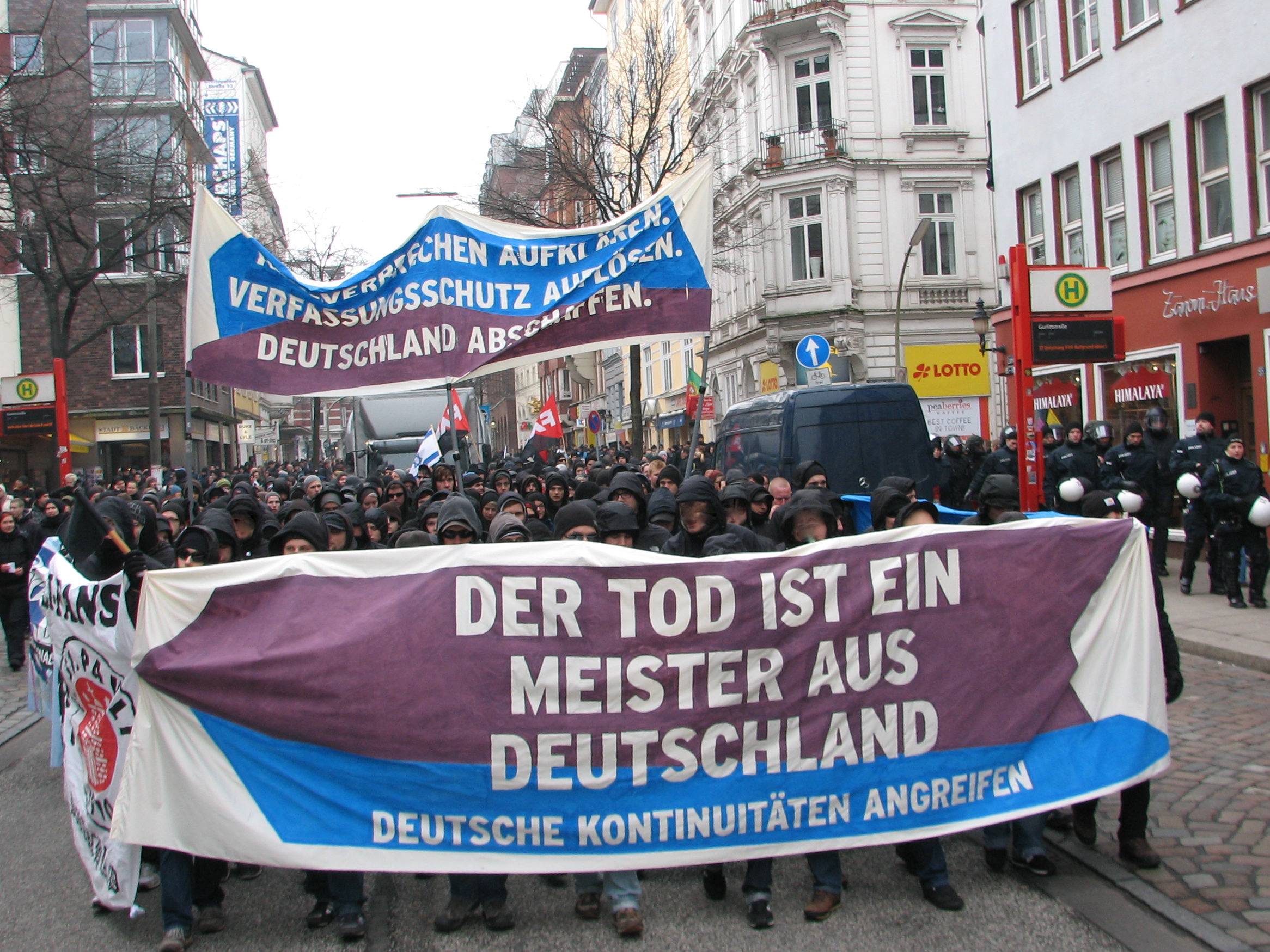 Unter dem Motto "Der Tod ist ein Meister aus Deutschland – Deutsche Kontinuitäten angreifen" und "Nazimorde aufklären und Verfassungsschutz abschaffen" demonstrierten heute über 1500 Antifaschistinnen und Antifaschisten kraftvoll und lautstark in der Hamburger Innenstadt. Hier unsere Bildergalerie Mehr Bilder hier (auf "weiter" klicken)