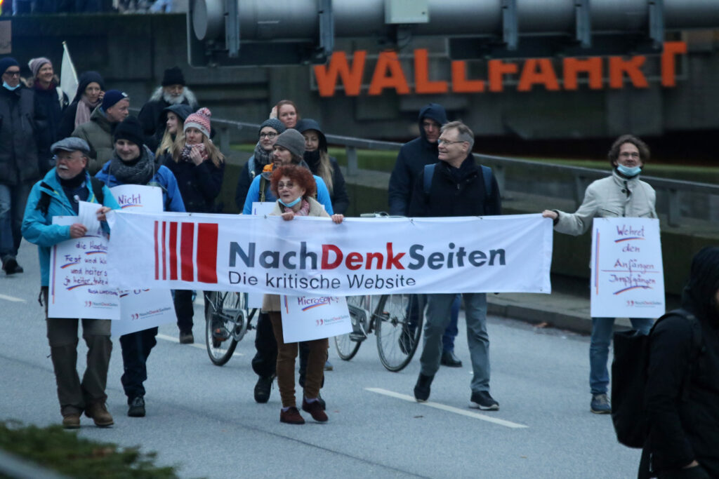 Auch die „Nachdenkseiten“ aus Hamburg bewegen sich in einem, vorsichtig ausgedrückt, problematischem Kontext. Während der Corona-Pandemie nahmen sie mehrmals an den Aufmärschen der Corona-Leugner-Bewegung unter dem verharmlosdenen Namen „Kunsthallen-Demos“ teil. Diese waren nach rechts weit offen: Reichsbürger*innen, Teile der AfD-Fraktion und Partei und Aktivist*innen der NPD nahmen an den Aufmärschen teil. Am 4. Dezember brachten die Nachdenkseiten sogar extra ein eigenes Transparent mit zu dem Aufmarsch.
